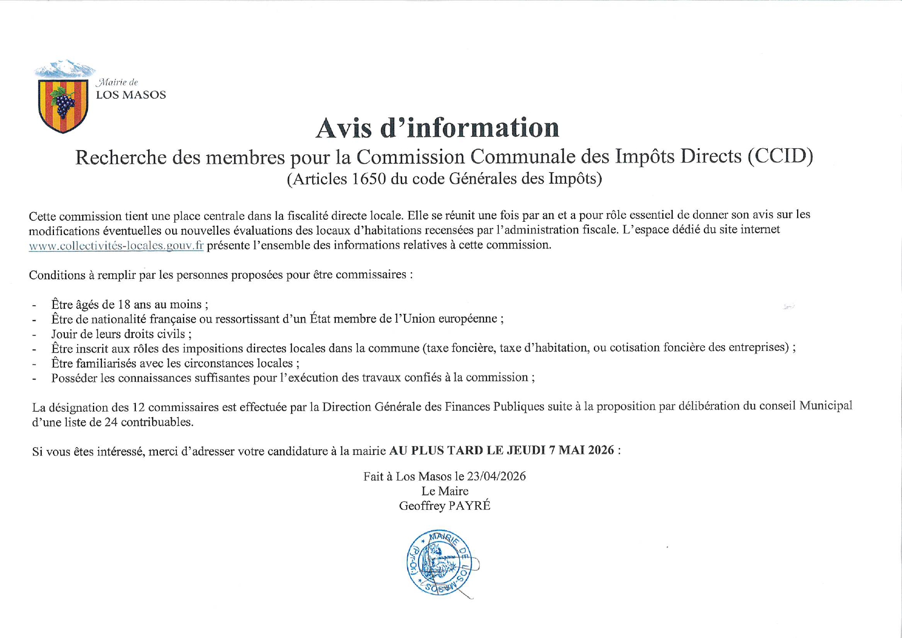 Vous pouvez adresser votre candidature à la mairie au plus tard le jeudi 7 mai 2026
